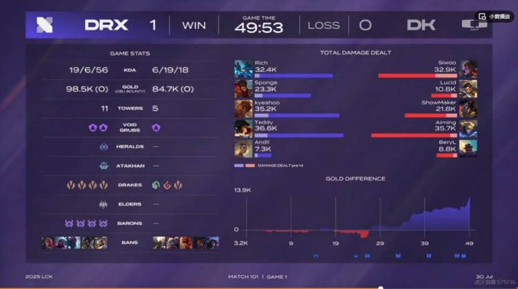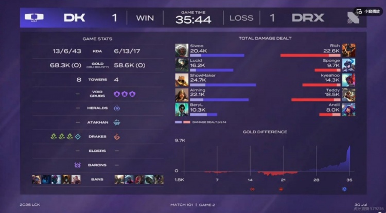 直播吧7月30日讯 2025年LCK第三赛段比赛今日继续,首场是涅槃组的DK对阵BFX!