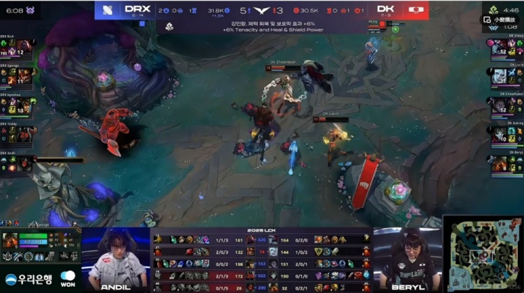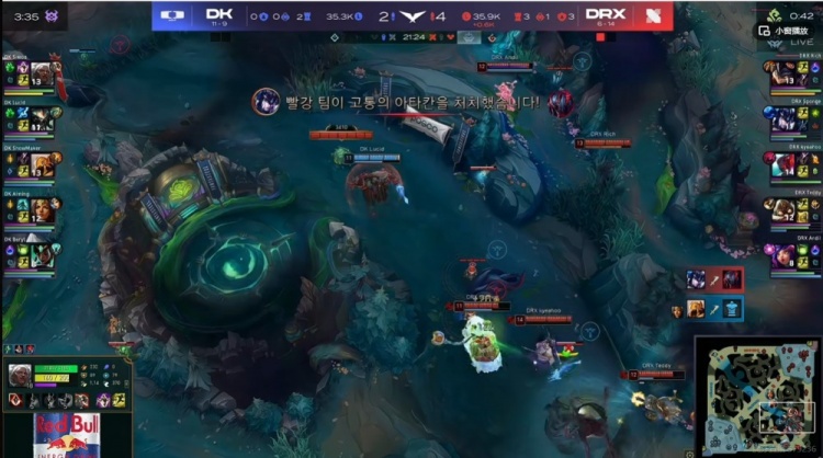 【35分钟】DRX再次开大龙,但是kyeahoo永恩空大了!没人管的SMK沙皇输出拉满,正面Andil妮蔻倒下之后Rich兰博和Sponge猪妹想拿大龙失败!Lucid斯卡纳抢到了大龙!DRX阵型彻底散了!DK逐个击破打出0换5团灭DRX,一波结束第二局扳平了比分!