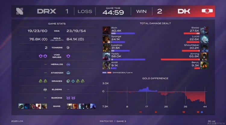 第二局双方持续缓慢节奏,DK先拿听牌龙给到压力,DRX绕后抓Siwoo安蓓萨被他拖够了时间,DK打出2换4之后拿下炼金龙魂,DRX被迫强开大龙,结果被发育成型的DK双C拉满输出!DK一波0换5团灭+抢龙成功扳平比分!