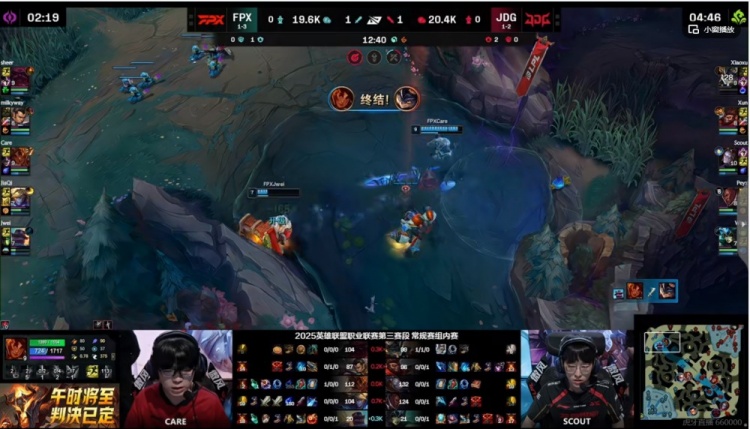 首局比赛JDG一级团打出JiaQi的EZ闪现之后拿到下路线权+先拿两条小龙!中期FPX则是依靠奥恩大招劝退也拿了三条小龙!关键厄塔汗团前JDG逮捕了Care岩雀,FPX还想看结果几乎都吃到了兰博娜美发条的三大招!JDG一波追击团灭FPX拉开经济差,随后又是小龙团拉扯掉了FPX强开拿下大龙!虽然自己双C一人送了一次大的,但是最后的高地团Scout发条开出了金身,队友支援赶到反手团灭FPX,JDG一波结束首局比赛!