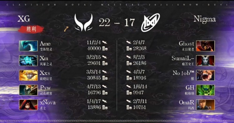 首局比赛Nigma选出末日女王獣的三核,对线期连续击杀Ame水人,还抢掉7分钟经验符,中期一度拿下7K经济优势,但是Nigma带盾没法推进上高被XG将比赛往后拖,Ame水人爽刷让XG将经济差拉回!关键的肉山团No!ob獣抢盾失败白给,Ghost末日大到了蓝猫的林肯上,XG一波追击高地先拆一路直接反超经济!比赛往后进行XG双大哥成型不给机会,带盾Ame水人直接波高配合队友瞬秒Nigma双大哥,Ame水人团战暴走收割结束首局!XG先拿一分!