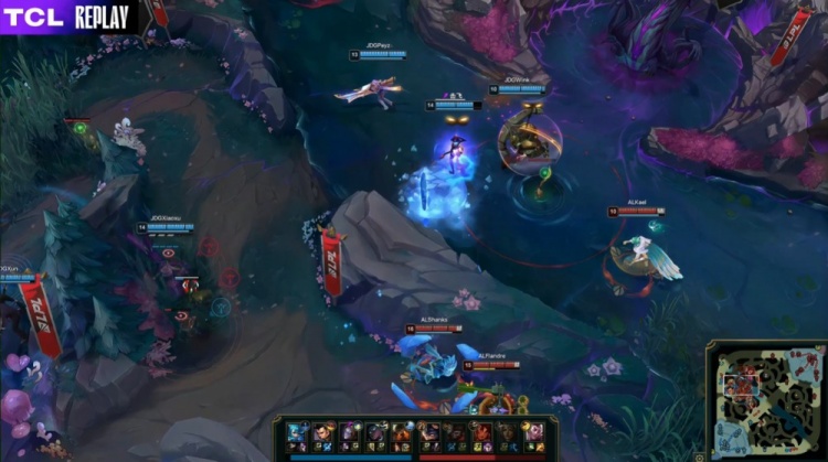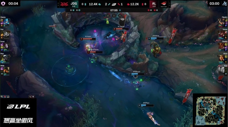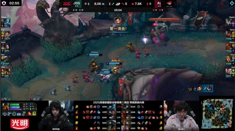 【22:40】AL入侵JDG下半野区,Xiaoxu格温1v4被反杀,随后中路团战,Scout又被Shanks岩雀抬回击杀,Wink也被带走,AL打出0换2,回头吃掉土龙魂,经济领先2k。