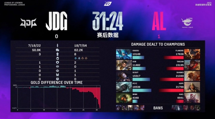 后期AL接连在下半野区与中路打出击杀并吃下土龙魂,第一波大龙团中Tarzan猴子开JDG三人,Scout发条空大,Hope希维尔击杀Wink泰坦。随后第二波大龙团Scout被Shanks岩雀抬回融化,AL打出2换4后再次赢下团战并拿下大龙。