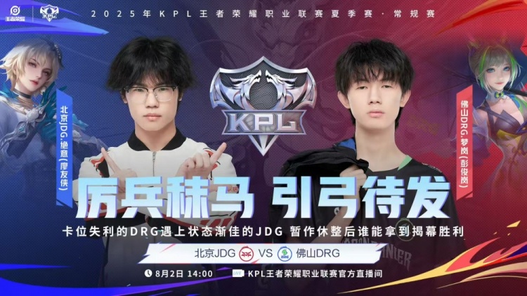 直播吧8月2日讯 2025KPL夏季赛常规赛第三轮,今日首场比赛是由北京JDG对阵到佛山DRG!第一局:前期JDG打出节奏但是十分钟被DRG换龙反制,DRG打赢团战拿下首局!第二局:DRG前期打出掉点但是被JDG反打扳回,随后JDG一路平推拿下胜利!第三局:双方前期疯狂拉扯难分胜负,后期JDG凭借野射发挥拿下DRG先拿赛点!第四局:双方鏖战二十分钟最终JDG赢下龙王团战顺利拿下DRG!