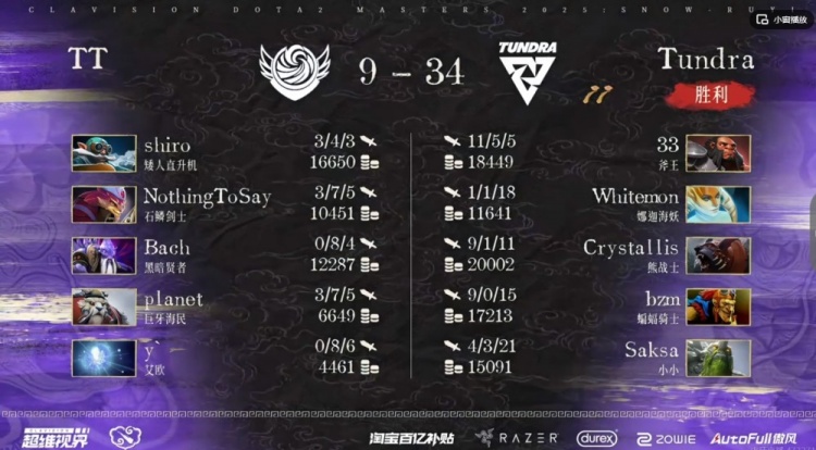 第二局比赛TBD一选黑贤但是被Crystallis拍拍直接克了,拍拍上路对线一打二毫无压力,又解放了酱油游中猛gank莫言的滚滚!7分钟经验符团只有5级的滚滚支援没啥办法!Tundra8分钟拉开3K经济差之后稳步扩大局势,无解肥的Crystallis拍拍团战端两下一个打出爆炸AOE,TBD面对巨大的装备差毫无还手之力,第二局遭遇Tundra速通掉入败者组决赛!