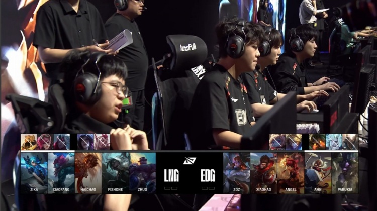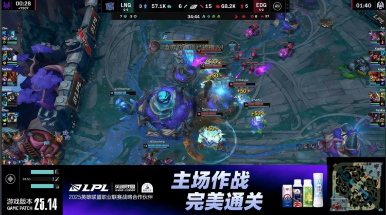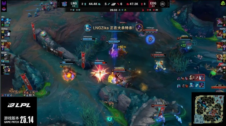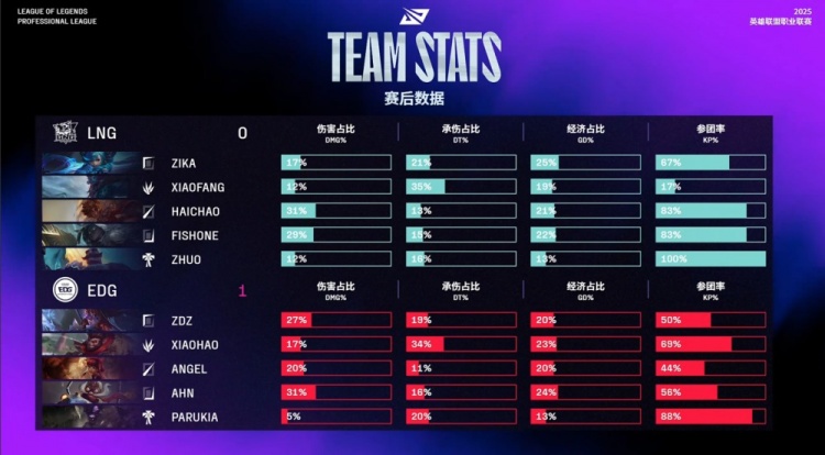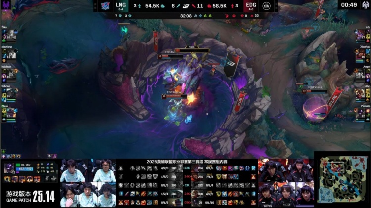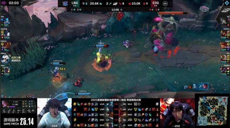 后期LNG大龙逼团失败,Xiaohao猴子与Ahn飞机先后击杀Haichao岩雀与Xiaofang巨魔,EDG掌控全局。最终EDG拿到老龙后中路推进,轻松击溃LNG,一波推平LNG基地先下一城。