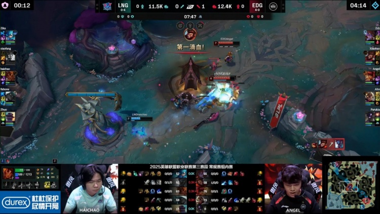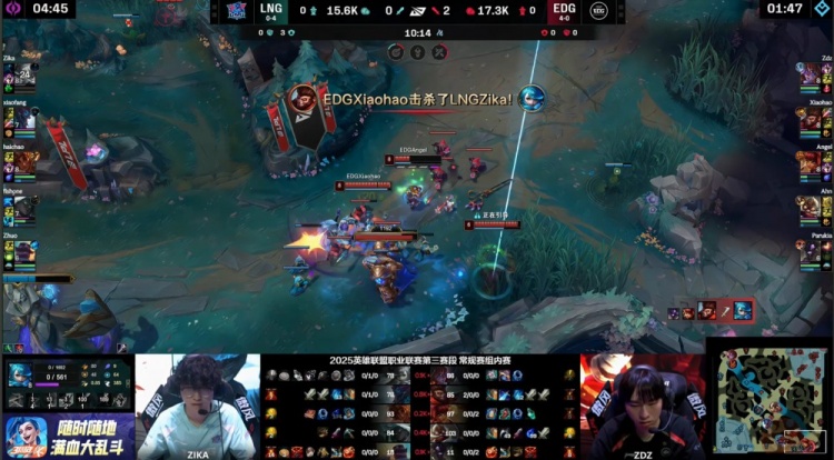 【22:02】河道团战,haichao岩雀抬EDG两人,但随后双方AD率先互换,双方拉开,angel闪现空w没能抓到人,EDG经济领先3k。