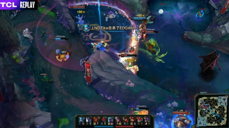 【11:48】河道团战,EDG三打四,Ahn飞机瞬间双杀,EDG打出1换2,随后LNG三人去上越塔带走Zdz阿萝拉,angel安妮下路与xiaohao推掉LNG下路一塔,中路Ahn吃布隆被动被打晕,fishone塞纳拿到人头,EDG经济领先2k。