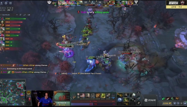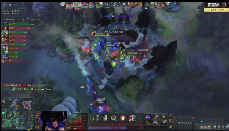 【21分钟】Tidebound找到机会偷打了肉山,shiro恐怖利刃带盾。利用盾的优势,Tidebound推掉了2路二塔。