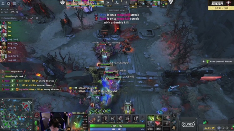 【29分钟】Tidebound下路推进,Whitemon沉默让shiro恐怖利刃没能换出血,恐怖利刃倒地,Bach痛苦女王和NTS船长配合将入场的Crystallis大圣收割,双方互换,Tidebound保持经济领先。