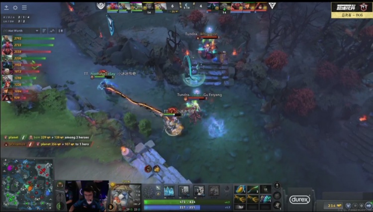 【11分钟】Tundra入侵野区动手,y海民躺枪滚雪球出来以后倒地,不过拖延了足够的时间,NTS船长过来标记水船加shiro痛苦女王大招接planet风行者致命箭反打将Tundra打三人阵亡经济领先7K。