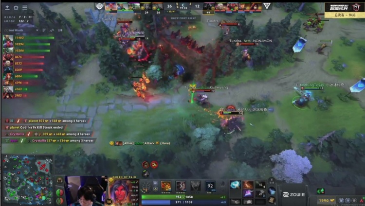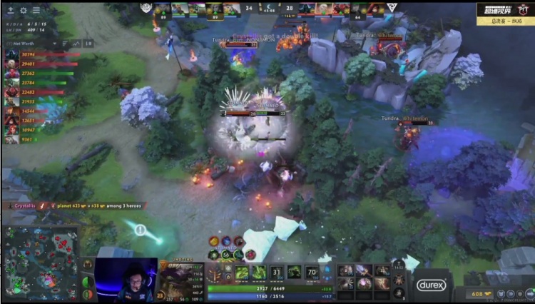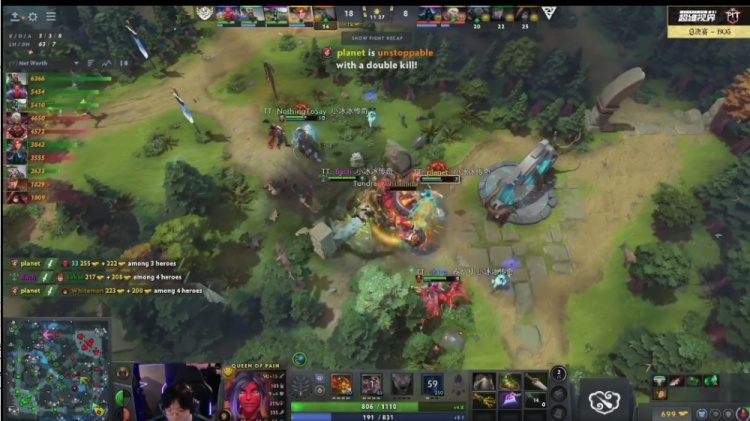 【19分钟】Tundra下路追击,这次走地33斧王一路追着planet风行者,风行者被斧王和玛西联手针对击杀,Whitemon术士交大招就为了杀y海民,Tidebound双辅助拉扯打满,可惜正面输出少了风行者,没能第一时间击杀Crystallis亚巴顿,最后击杀亚巴顿,却被Tundra追上打了一波四人阵亡。