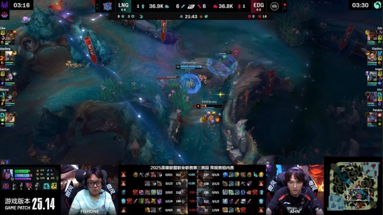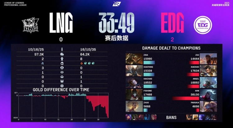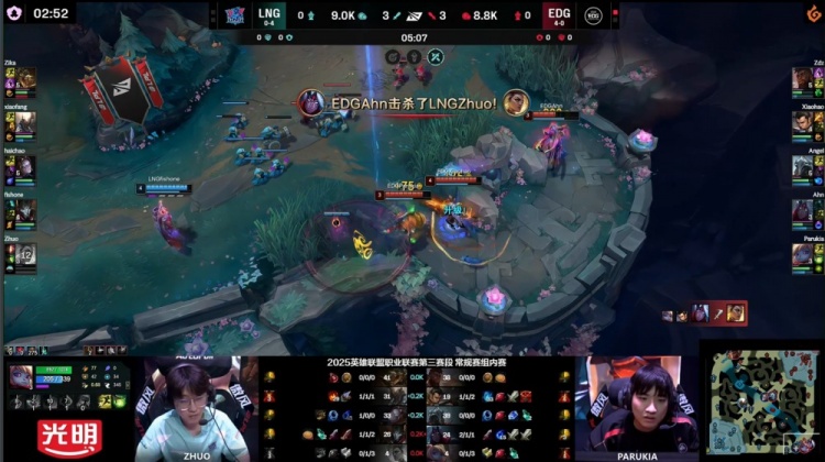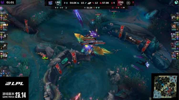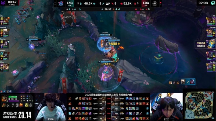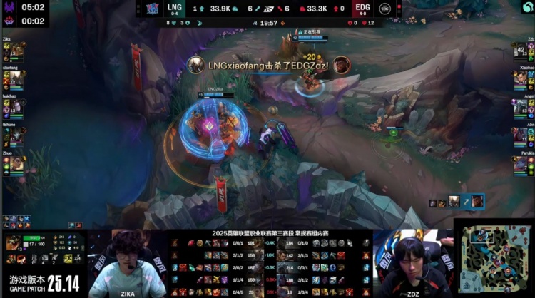 中期xiaofang潘森控下先锋但LNG没能拿到先锋之眼,EDG通过中路击杀Zhuo扩大主动权,随后xiaofang与Zika鳄鱼配合击杀Zdz奎桑提,xiaohao及时控下小龙稳住局面。后续Parukia入侵被抓,EDG仍依靠Angel维克托反打拉扯后控下厄塔汗。
