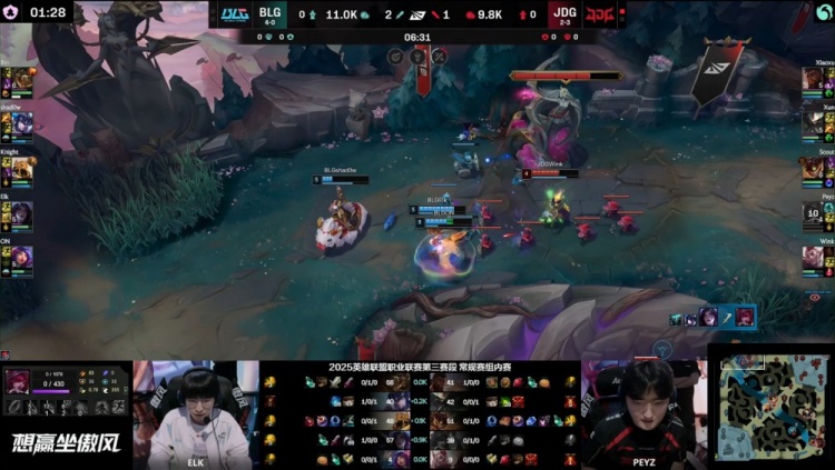 【6:23】上路BLG三人强越Peyz霞得手,ON妮蔻变炮车扛塔,Wink洛被shadow小猪定住,Elk卡莎暴雨跟上吃掉人头,BLG打出0换2。