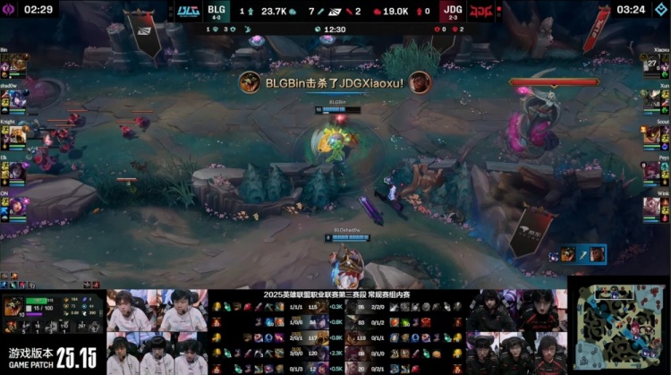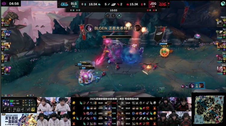 【25:20】上路Wink被抓,野区Xun蝎子被抓,JDG野辅瞬间阵亡,BLG打出0换2,回头吃掉大龙,中路推进,Elk卡莎被复活的Xun终结,BLG中路冲上JDG高地,高地团战,Wink洛开大开knight,后者大招推JDG三人,Knight瞬间双杀,BLG打出1换3,一波推平JDG基地扳回一城。