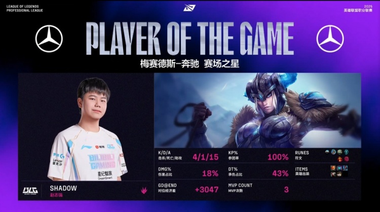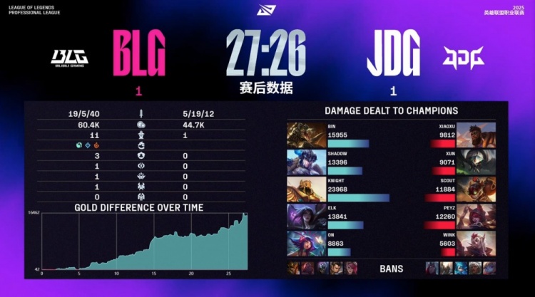 第二局前期,Scout岩雀在河道回城时被shad0w小猪逮捕送出一血,随后shad0w与ON妮蔻配合在上路越塔击杀Peyz霞与Wink洛,JDG四路爆炸,15分钟BLG经济领先接近1w,BLG提前宣布比赛结束。