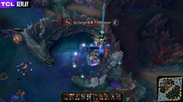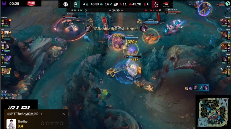 【24:11】iG中路推掉AL一塔,Tarzan猴子绕后被抓,王杰卡莎进场被Rookie发条瞬间融化,正面团战AL不堪一击,iG打出0换3吃掉小龙,