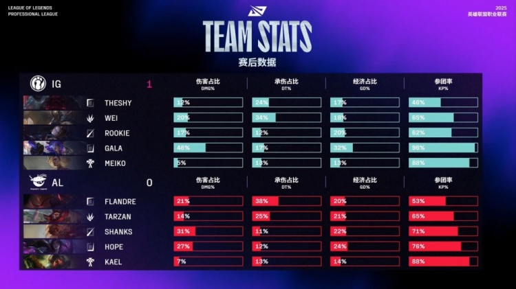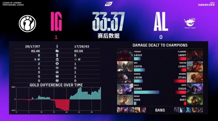 中期AL通过上路埋伏与先锋团反打由Shanks岩雀与王杰卡莎斩获多个人头,打出0换5后短暂反超经济。后续iG在厄塔汗团中集火AL上野,GALA芸阿娜爆轰五杀完成团灭,iG实现经济反超。