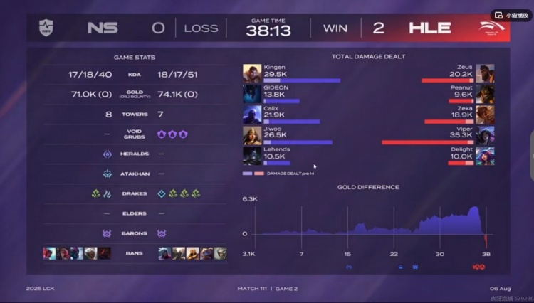 直播吧8月6日讯 2025年LCK第三赛段比赛今日继续,首场比赛是登峰组的HLE对阵NS!
