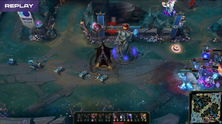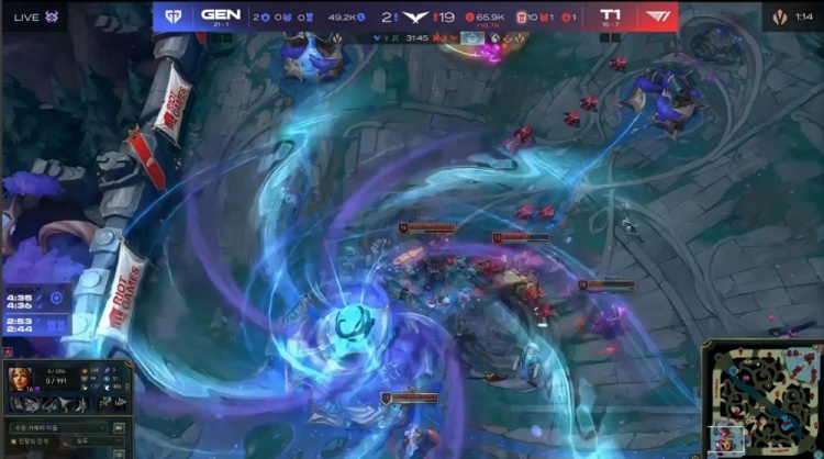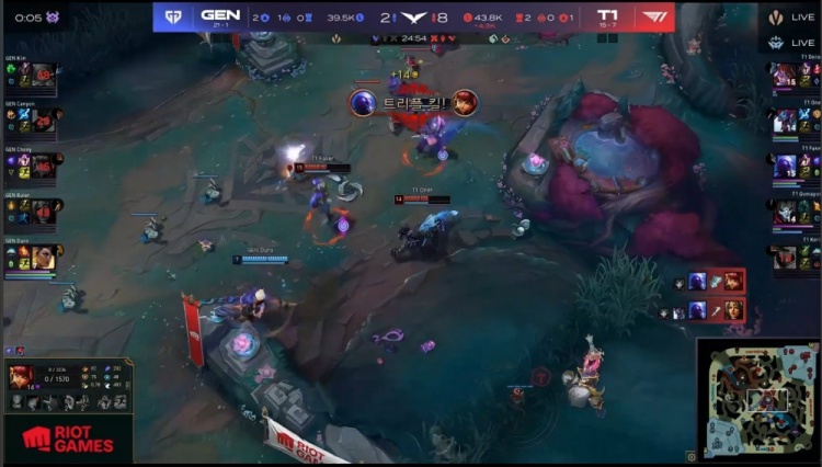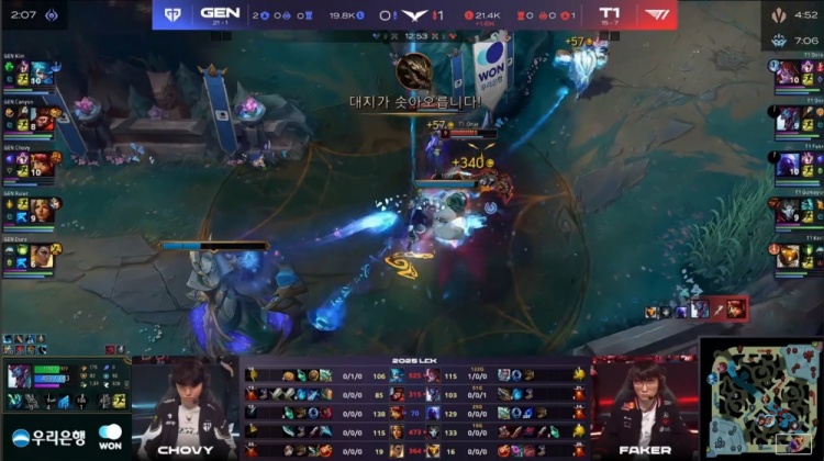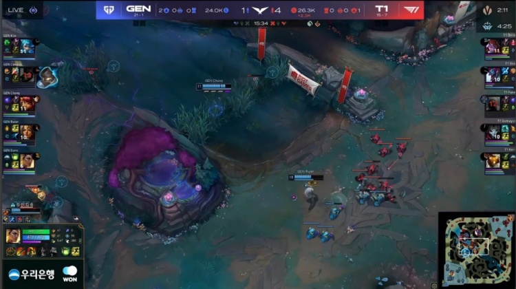 中期GEN集火Faker瑞兹打出1换1,虽然GEN拿下小龙但防守失误导致上路二塔被推,T1维持经济领先。