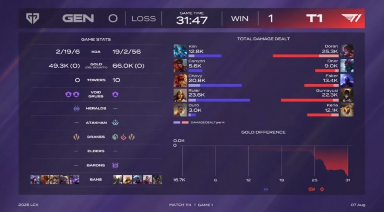 后期Duro芮尔尝试先手未果被反杀,Faker瑞兹轰出三杀,T1团灭GEN后拿下大龙,经济扩大至8k以上。厄塔汗团战Gumayusi烬架狙先杀Canyon猴子,Doran阿萝拉正面爆发完成三杀,GEN多人阵亡后被T1彻底压制。最终T1冲上GEN高地融化GEN,一波推平基地先下一城。