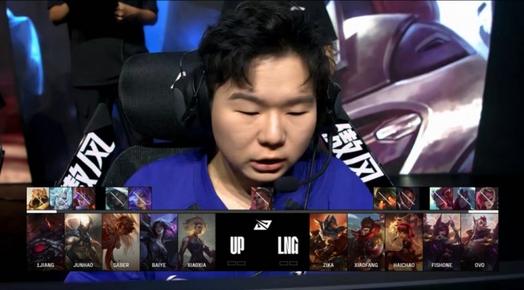 第一局前期,LNG依靠Zika兰博与xiaofang猴子在小龙处连斩UP前排和打野,并通过多点小规模击杀稳住经济优势。虽然Junhao潘森曾配合队友击杀fishone霞,但Baiye卡莎随即被换掉,双方经济胶着。