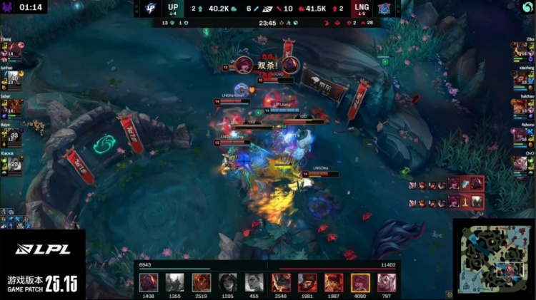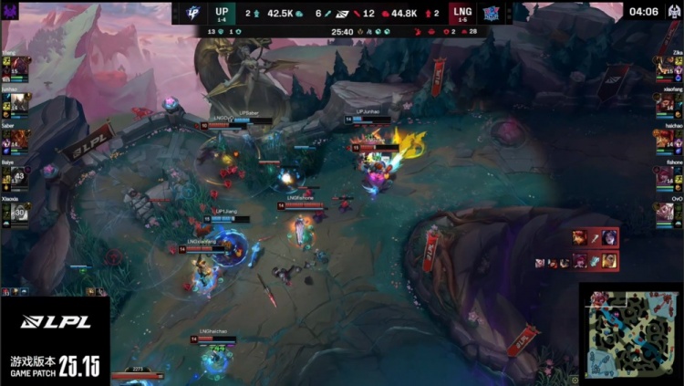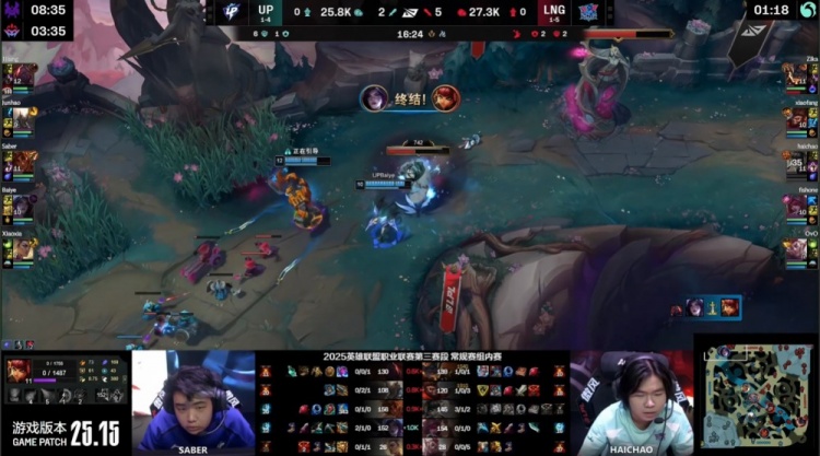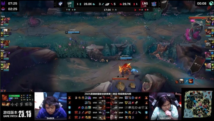 【25:29】Zika上路兰博上路被开,双方支援到位,haichao安妮提伯斯拍脸单杀Baiye卡莎,LNG打出0换5团灭UP,回头吃掉大龙,经济领先6k。