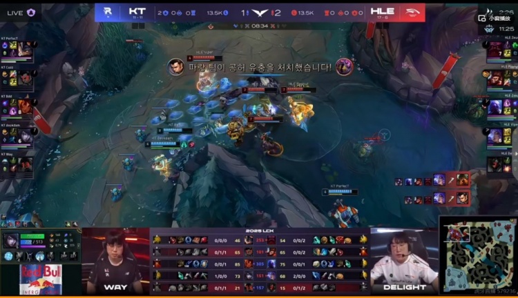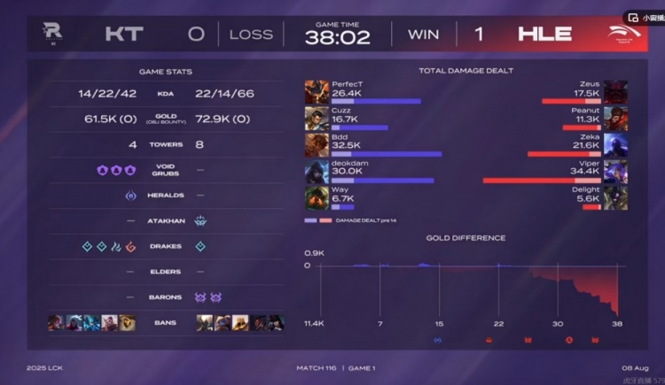第一局前期PerfecT兰博补刀反而被少吃一波线的Zeus奥恩压制,但是中期Zeka瑞兹连续开车白给,KT稳扎稳打先拿下听牌龙!HLE则是连续减员KT之后拿下两条大龙!不过关键的海克斯龙魂团Deokdam厄斐琉斯阵亡之前拉满输出,双方打出3换3但是是KT的电龙魂!不过随后中路团Zeus奥恩大招击飞五个帮助HLE赢团拉开经济差!最终的远古龙团先手被打残的Delight牛头回城绕后找到机会,闪现二连顶回Deokdam厄斐琉斯杀死比赛!HLE正面团0换4,从中路一波结束比赛!