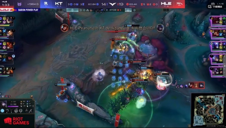 【17:50】小龙团,Zeus奥恩大招+闪现打残Deokdam厄斐琉斯,但是开大一起进场的Zeka瑞兹直接白给了!回头HLE抱团拿下第三条小龙!KT也不敢开,双方拉开!