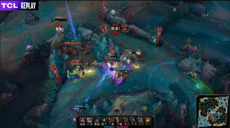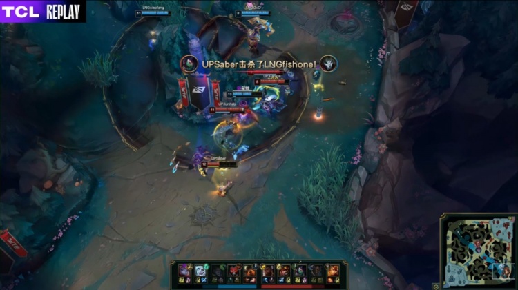 【19:55】下路混战,LNG强推UP下路一塔得手,但Saber阿卡丽进场融化fishone烬,Zika波比落单被卖,OvO送Junhao人头,UP打出0换3,经济领先2k。