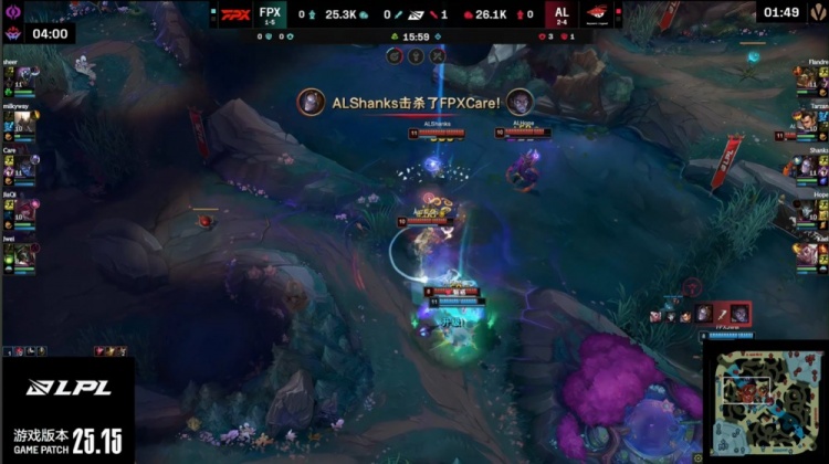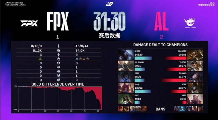 后期AL大龙逼团,Kael洛开Care得手,FPX四打五反被打出0换3,银河潘森跳大抢龙失败送头,AL吃掉大龙,冲上FPX高地将其团灭,最终AL推掉FPX基地,击杀比锁定在0-15,AL拿到比赛胜利。