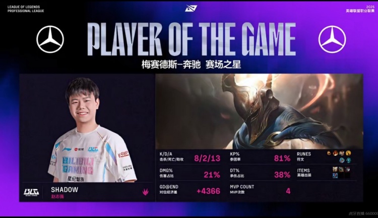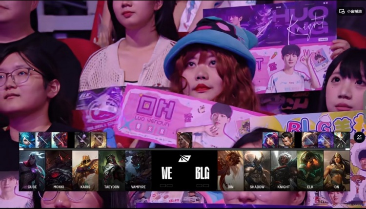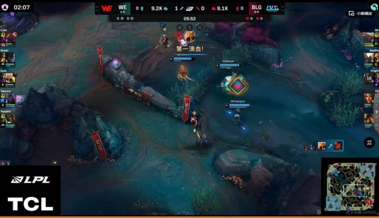 首局比赛WE拿下一血,而且沙皇+大树的中野通过运营换线还先行拿下了前期所有的资源!但是先锋团Bin安蓓萨一个关键绕后强杀对手中野辅,配合队友在3打5的情况下团灭了WE!随后小龙团又是Bin安蓓萨大招进场一打三分割了WE阵型!BLG连续两次团灭对手,拿下小龙+厄塔汗之后拉开经济差!随后WE野区抓ON泰坦失败,BLG打出0换4拿大龙再拆对手两路高地,坐拥12000经济优势奠定胜局!最终WE下路高地强开knight岩雀未果,BLG再一次打出0换4结束首局的比赛!