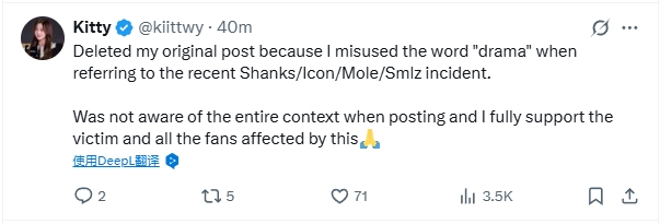 “我删除了原帖,因为我在提及最近的Shanks/Icon/Mole/Smlz事件时误用了“drama”一词。
