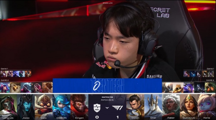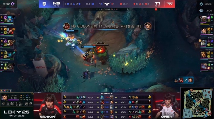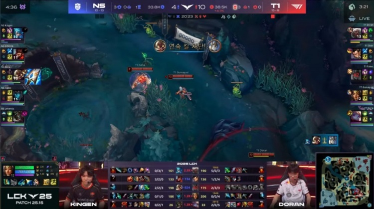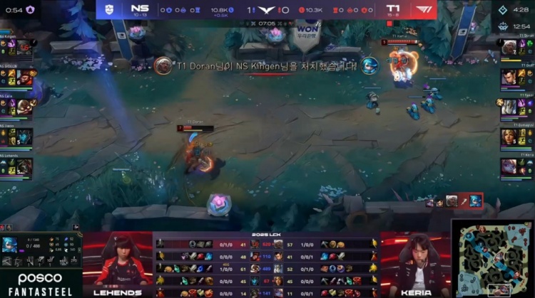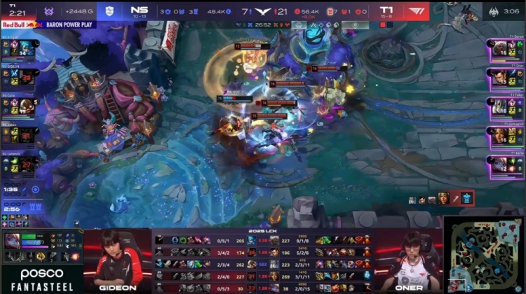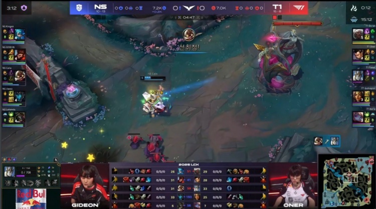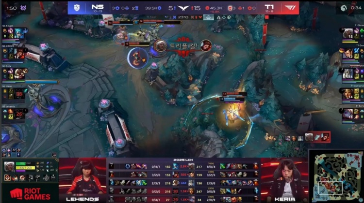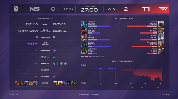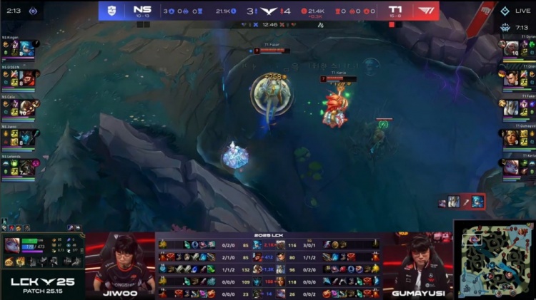 后期NS尝试通过分推寻找机会,但被T1多次抓住落单目标,多兰安蓓萨爆砍三杀,Kingen格温战绩来到0-5,最终Gumayusi三杀收尾,T1推平NS基地赢得比赛胜利。