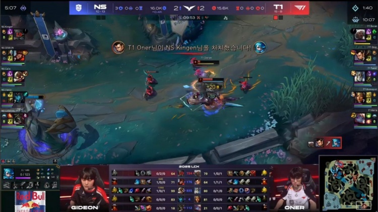 【7:58】Oner赵信偷NS的红buff被抓,GIDEON配合calix飞机将其击杀,双方经济持平。