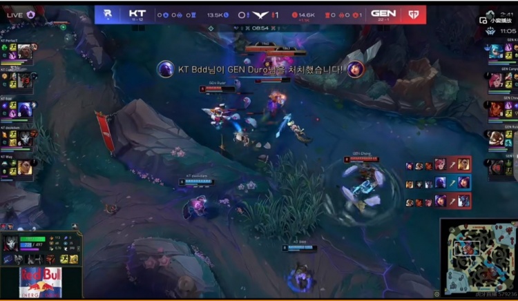 【22:43】小龙团,Bdd瑞兹向前交闪配合队友强杀Duro妮蔻,但是KT一群人堵在了单向车道里被Kiin格温大招AOE打了个爽!最终Chovy岩雀大招封后路留住没闪的Bdd瑞兹,GEN团灭KT,拿下小龙!经济差快7K了!