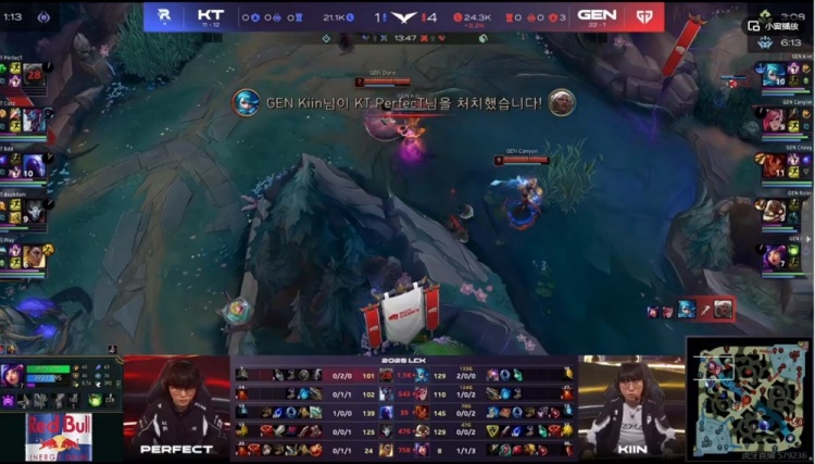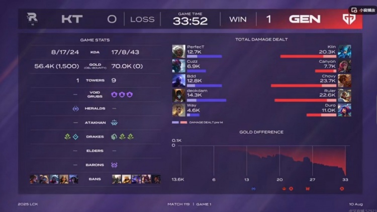 首局比赛PerfecT安蓓萨上路对线本来抗压,但是换线之后直接被GEN野辅越塔强杀两次没了声音!Kiin格温舒舒服服十来分钟就对位领先1500了!GEN也早早拿下4K优势打出战略点!中期虽然Chovy岩雀+Canyon蔚两次越塔开送,但是KT想打大龙未果,又被GEN反手留住Way芮尔之后完成对大龙的接盘!GEN稳步推进拉开一万经济差,最后一波团战Duro妮蔻绕后坐大KT双C杀死比赛!GEN先拿一分!