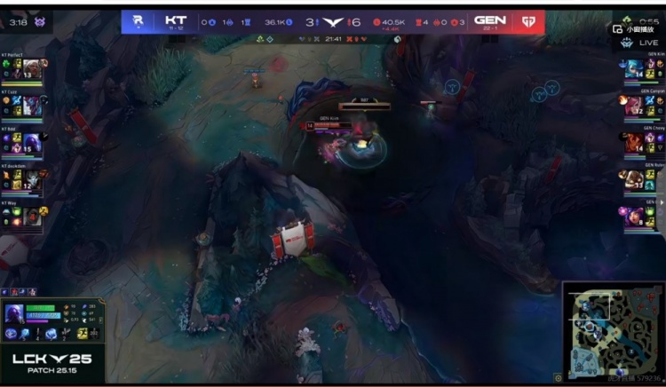 【25:01】GEN上路强行越塔失败,Duro妮蔻空大,Way芮尔绕后成功吸两个留人!Chovy岩雀先倒之后TP落地进场的Kiin格温没闪被KT众人围杀!KT打出0换2想大龙逼团,但是留不住人啊,被Chovy岩雀开大配合队友反杀掉Way芮尔!反而是GEN成功接盘了这条大龙!