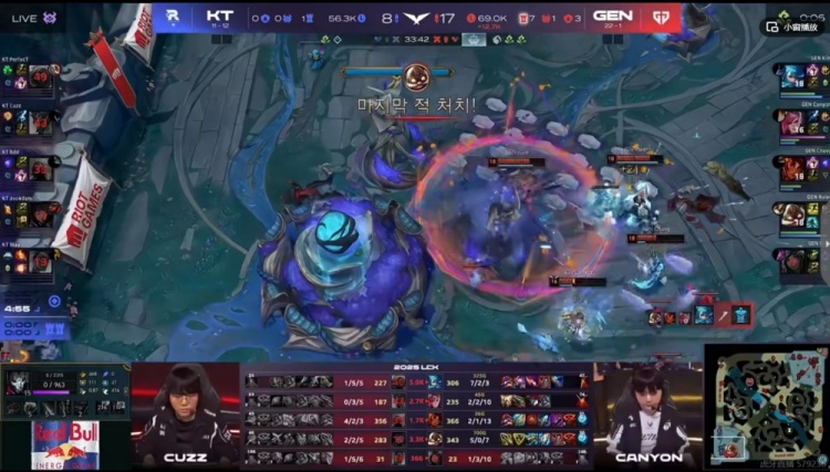 【33:02】大龙刷新,KT还想摸GEN的中一塔,结果被右后方绕后的Duro妮蔻直接坐大到了双C!这俩人先后倒下KT没战力了啊!Canyon蔚带队追上高地,逐个击破GEN完成对KT的团灭,结束首局的比赛!