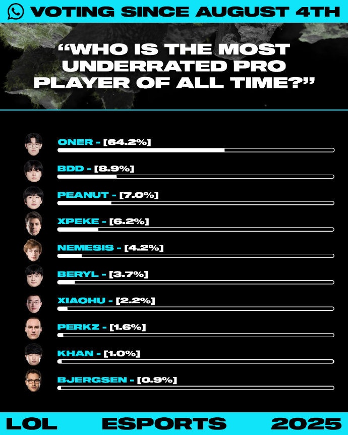 LOL社区投票”谁是有史以来最被低估的职业选手“:Oner64.2%得票