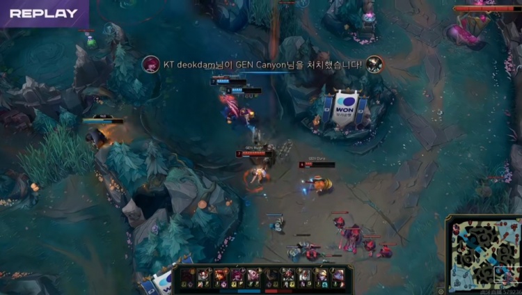【8:37】双方换线,KT下路组直接都被打残,KT中路中野双大打掉了Chovy加里奥闪现,但是GEN已经拿到了三虫!