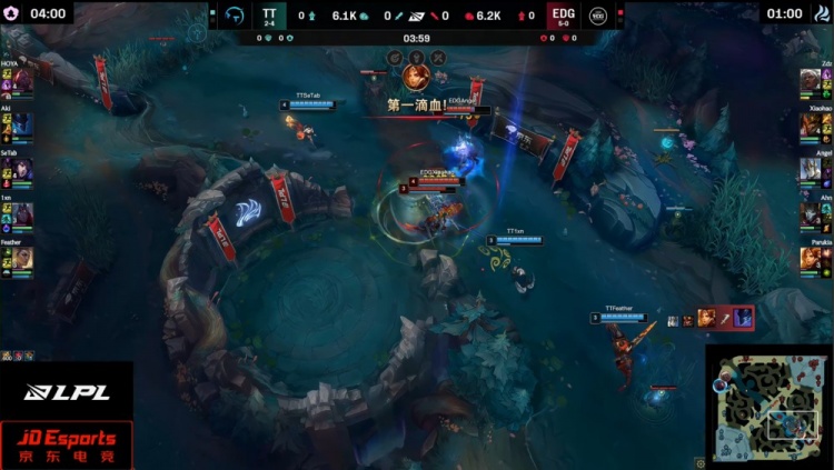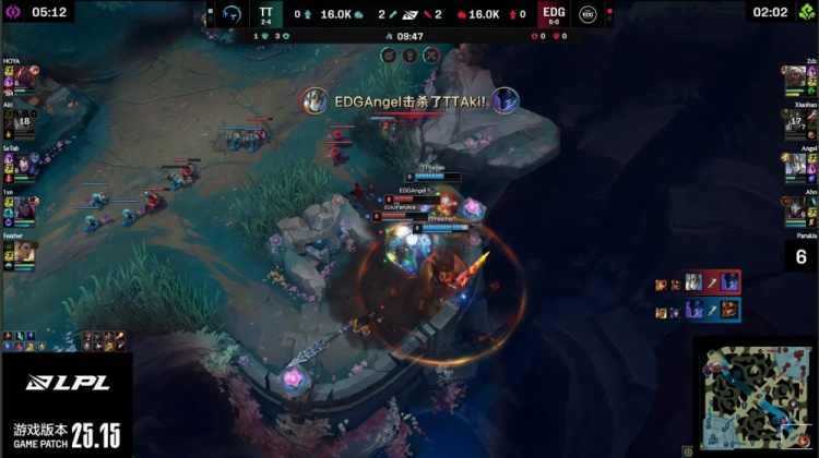 【15:55】Parukia女坦中路被逮捕残血撤退,Ahn烬架狙逼退TT,TT放掉先锋,xiaohao轻松拿到先锋,EDG经济领先1k。