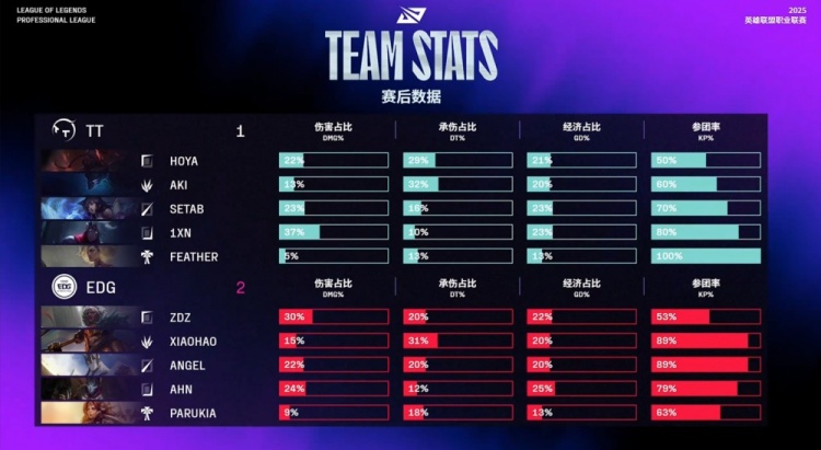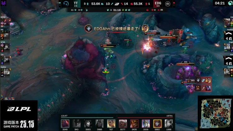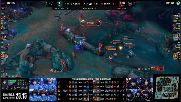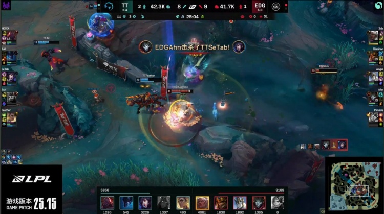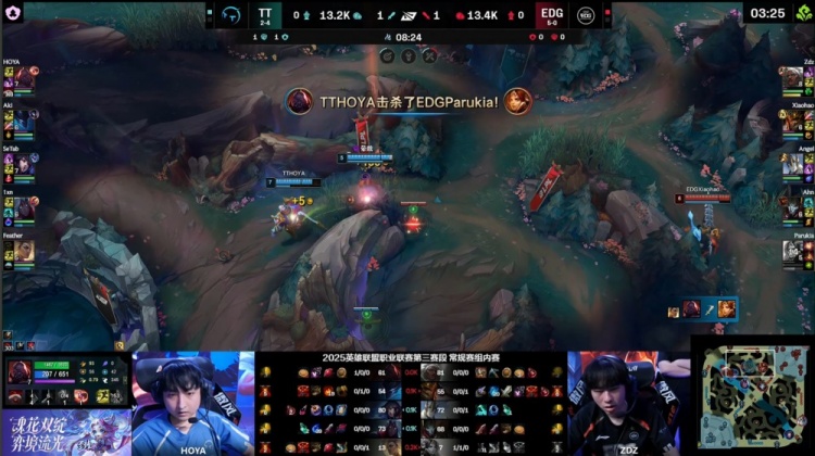 直播吧8月10日讯 2025LPL第三赛段常规赛组内赛继续进行,最终凭借Zdz两局出色发挥,EDG让一追二战胜TT,拿到涅槃组六连胜的同时,提前确定晋级骑士之路!