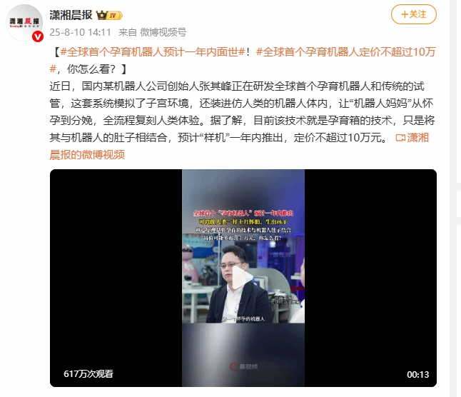 根据IT之家的消息,潇湘晨报近日报道,国内某机器人公司创始人张其峰正在研发全球首个孕育机器人和传统的试管,这套系统模拟了子宫环境,还装进仿人类的机器人体内,让“机器人妈妈”从怀孕到分娩,全流程复刻人类体验。