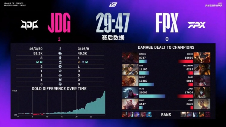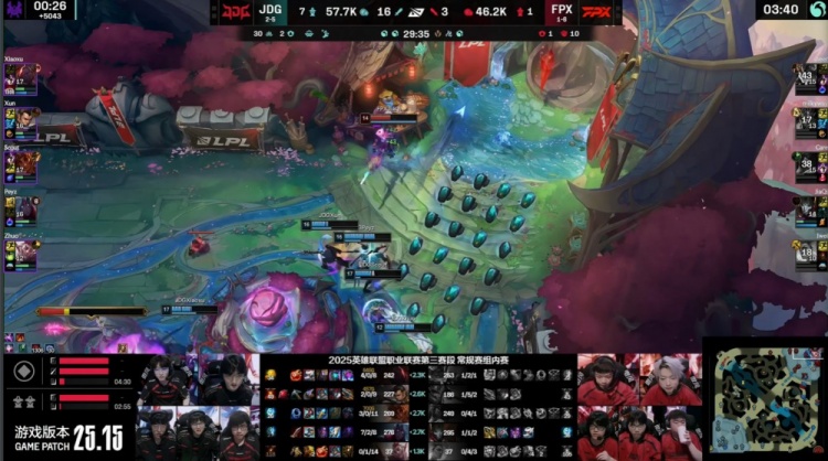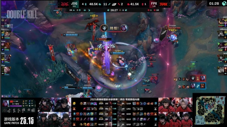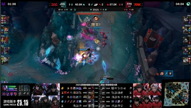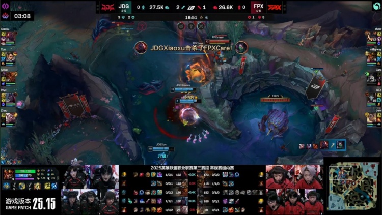 中期先锋团Care阿卡丽被Scout岩雀抬回,Xiaoxu赛恩接控配合队友击杀,JDG拿下先锋,FPX收下小龙听牌水龙魂。随后Xun赵信入侵红区击杀Jwei芮尔,河道混战Xun赵信挑飞银河皇子,后者连续阵亡。龙魂团JDG打出1换5团灭FPX。
