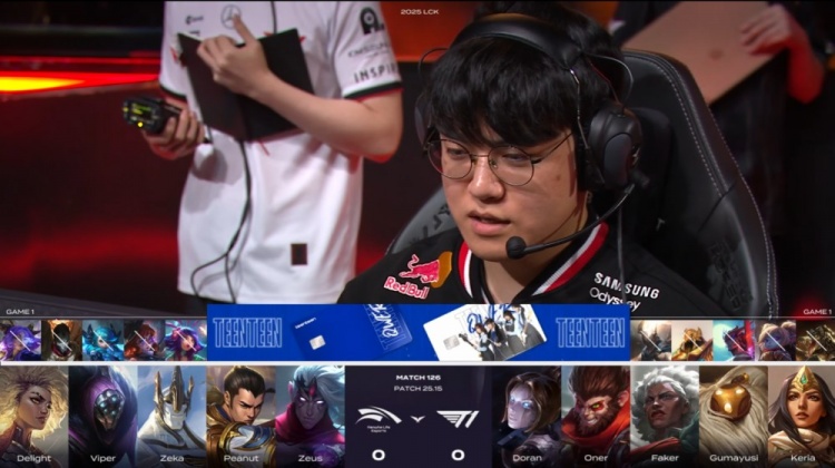 第一局前期,Keria巴德在上路被集火阵亡,Viper韦鲁斯拿到一血。后续巢虫团中,Delight芮尔先手击杀Keria巴德,HLE上路越塔击杀Faker发条。