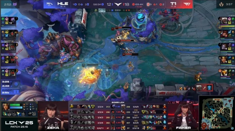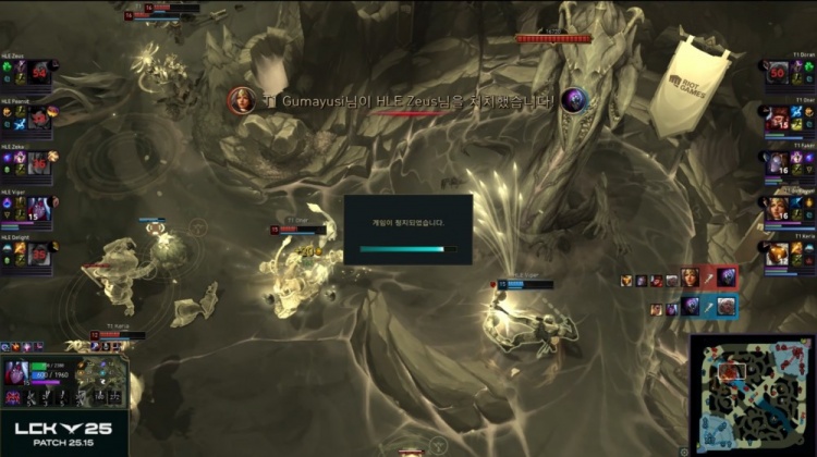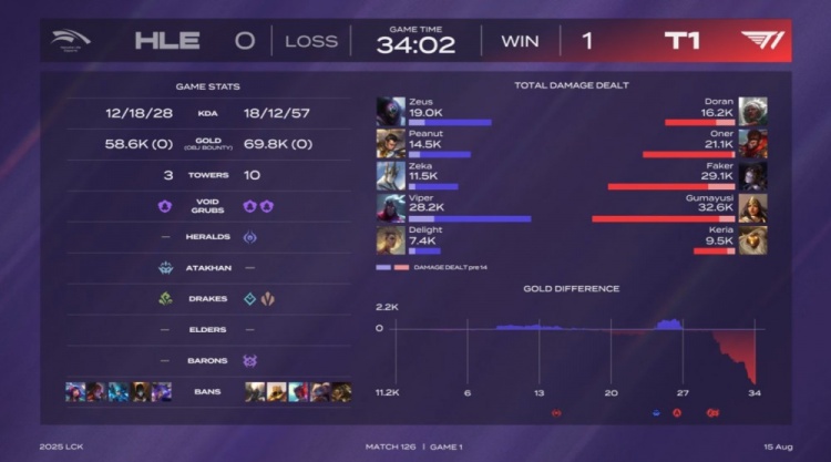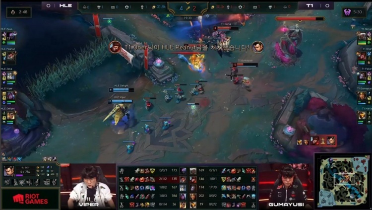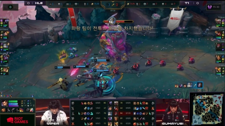 后期T1下路越塔击杀Zeka加里奥并在中路击杀Viper韦鲁斯,T1团灭HLE。随后大龙团战T1极致拉扯团灭HLE,最终T1在高地团打出0换4,推平HLE基地先下一城。
