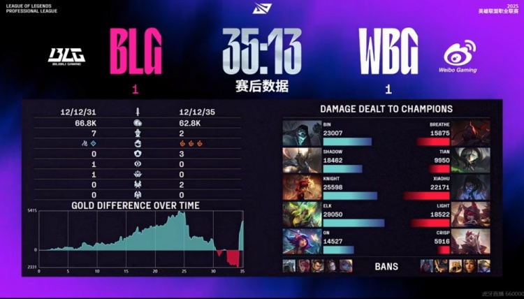 【34:30】中路团战,ON妮蔻找到机会闪现坐大五个!Light霞直接被打残没法输出了!哪怕WBG第一波反打先击杀妮蔻,但是BLG三核心持续拉扯输出逐个击破了WBG的前排!最终Elk泽丽配合队友完成收尾,BLG打出2换5团灭WBG结束比赛!扳平了比分!