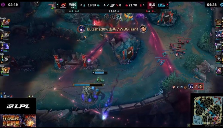 【11:51】镜头一转Breathe杰斯阵亡,BLG拿下小龙!ON机器人一钩再留Crisp巴德!Xiaohu瑞兹开车带队友三人想追没追成,Bin鳄鱼绕后TP红怒落地再留WBG下野两人!BLG打出0换4!大获全胜之后拿下2K经济优势!
