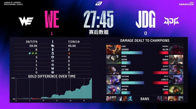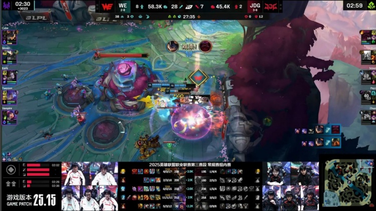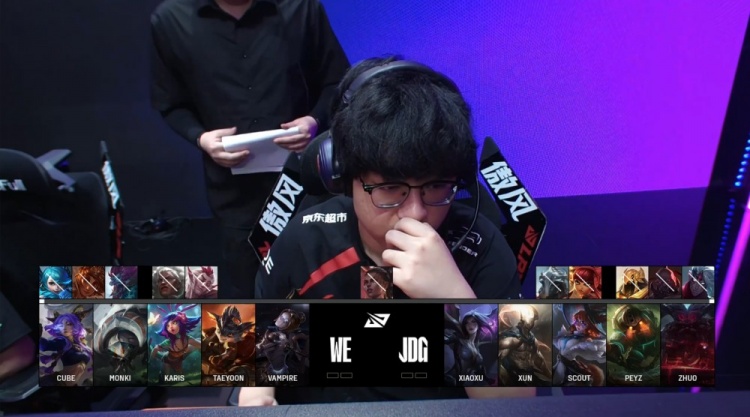 中期Monki蝎子先锋团被反开,Xun潘森连杀两人,Peyz卡莎击杀Taeyoon芸阿娜,Karis发条与Cube兰博合力击杀Scout阿萝拉,WE打出3换4。紧接WE中路推进,Karis发条二塔下大招拉JDG两人,WE再度扩大领先。